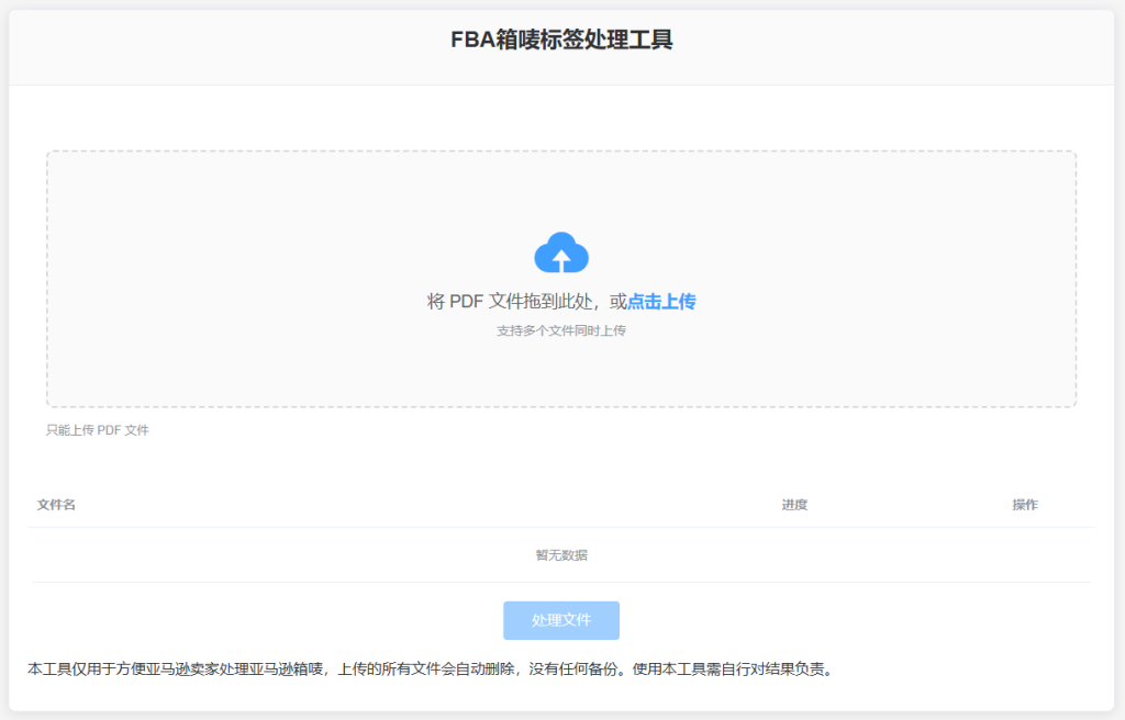 该工具使用非常简单方便,只需要上传从亚马逊后台下载的fba箱唛pdf文件,点击处理文件即可;